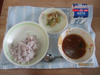 今日の給食は「雑穀ご飯、夏野菜カレー、カルちゃんサラダ」でした。カボチャなどの夏野菜がごろごろ入った美味しいカレーでした。6年生たちの配膳の様子は、手際がよく安心してみていられます。1年生からの毎日の積み重ねで、技能が身に付き、協力してできるようになっていくのですね。