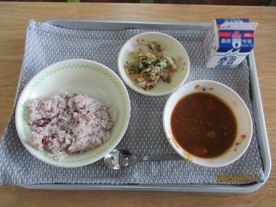 今日の給食は「鶏飯(ご飯、汁、具)、スタミナサラダ」でした。ご飯の上に具をのせて汁をかけて食べる鶏飯(けいはん)は、奄美地方の郷土料理だそうです。おいしかったです。