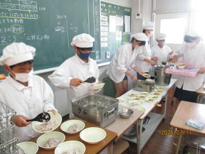 今日の給食のおかずは「魚素麺汁、豆腐のチーズ焼き、わかめときゅうりの酢の物」でした。熱々の汁物、冷たい酢の物、美味しさが引き立つように届けてくださっている給食センターの方々に感謝していただきました。ごちそうさまでした。