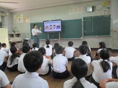 始まりの会では、向坂先生の司会進行のもと、校長から「なりたい自分、なりたいクラスを目指して主体的に学ぶ・行動すること」について、養護の清田先生からは、夏休み中に小林製薬様から洋式トイレのプレゼントがあったことの紹介や「早寝早起き朝ご飯」で元気に過ごすこと、どうしてもモヤモヤしたり暗い気持ちのときは相談してほしいこと、「かくれてしまえばいいのです」というサイトの紹介もありました。さっそく見て見ましたが、大人でもなるほどと、ホッとする内容でした。