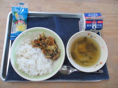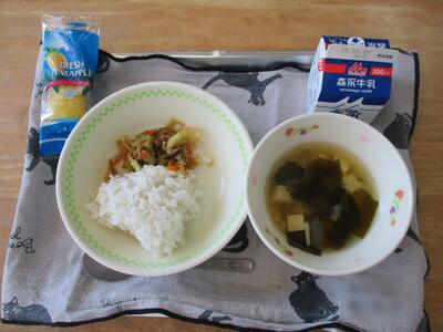今日の給食は「わかめスープ、ビビンバ、フレッシュパイン」でした。ご飯にかけて食べるビビンバは、子どもたちに人気のメニューのひとつです。パインもキリッと冷えて美味しさ満点でした。