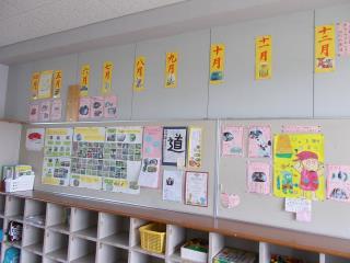 習字の作品や読書感想画など、たくさんの掲示があります。