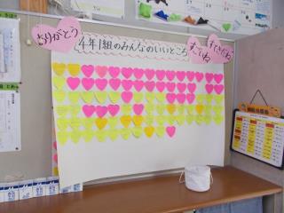4年生のみんなのいいところをハートの付箋に書いて掲示してあります。