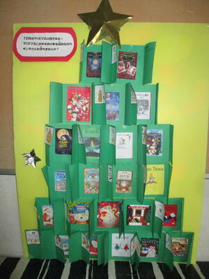 図書室入り口は、すっかりクリスマスの雰囲気。担当の塩﨑先生を中心に本を手に取りたくなる飾り付けがされています。