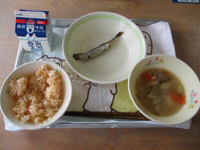 今日の給食は「キムタクご飯、栄養白玉汁、ししゃも香り焼き」でした。キムチとたくあんの入ったご飯は美味しくて、子どもたちにも大人気です。