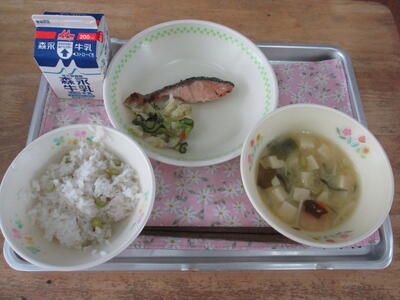 今日の給食のおかずは「じゃがいもの味噌汁、鮭のハーブ焼き、梅サラダ」でした。今が旬のじゃがいもがたっぷり入った味噌汁は、ほんのり甘くて優しい味でした。