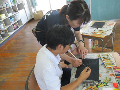 あおぞら1組では、クレヨンを使ったスクラッチに挑戦です。まず、真っ白い画用紙にいろいろな色のクレヨンを使いカラフルに塗り込みます。その上から黒のクレヨンを重ね塗りして、真っ黒な画用紙に。そして、割り箸などの先のとがったもので引っかいて好きな絵を描いていきます。子どもたちはアニメのヒーローを描きたくて、先生と一緒に仕上げていきました。私も小学生の頃、花火を描いたことを思い出しました。