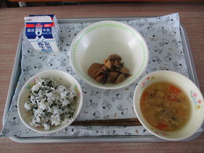 今日の給食のおかずは「わかめごはん、かき玉汁、がんもどきと野菜の含め煮」でした。しっかりした味付けで、暑い夏の疲れを吹き飛ばす美味しさでした。