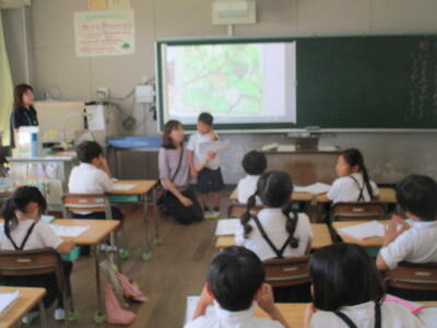 朝晩はずいぶん涼しくなりました。あおぞら4組の教室は秋模様。アイデア豊富な前田先生手作りのブドウやクリの掲示物が秋の訪れたを感じさせてくれ、心がほっこりします。国語の学習ではデジタル教科書が駆使され、集中して音読練習やフラッシュカードでの漢字練習に取り組んでいました。いろいろな活動を組み立て、いつも楽しく学べる工夫をされています。