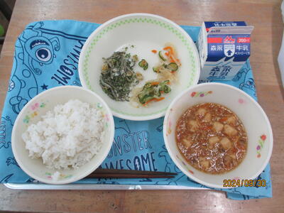 今日の給食のおかずは「麻婆豆腐、だいずといりこの青のりがらめ、ナムル」でした。給食の麻婆豆腐は辛すぎることなく、ご飯にかけて食べる人が続出の一品です。ごちそうさまでした。
