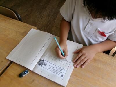 3年生たちはこれまでの学習をもとに、わり算であること、式は23÷4、4個ずつまとめる問題など、積極的に気づきを出していました。また、「答えは5あまり3で、このあまりをどうすればよいか」について式や図、おはじきを使って考え、自分の考えをノートに整理しました。大人であれば、残ったケーキを入れる1箱をプラスして全部で6箱必要とすぐ見破れますが、3年生たちはあまりの3をどう扱うかが難しく、みんなで議論し合いました。