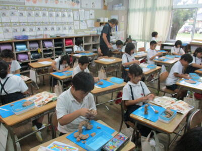 2年生たちは、9月から金曜日が6時間授業に変わりました。今日の5・6時間目は図工。粘土を使って「思い出をかたちに」と、思い出に残るできごとを形にしていました。友達に「見て見て!」と見せ合い、熱心に取り組んでいました。