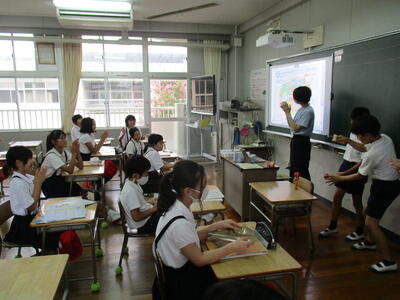 6年生たちは、シェイ先生がご家族で東京や京都など日本各地を旅行されたことについて、たくさんの写真を見せてもらい、英語での説明を聞き取っていました。8月始めに高道小にも立ち寄られたそうで、みんな驚いていました。