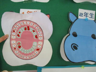 6月4日から10日は歯と口の健康週間です。本校でも、虫歯予防の意識を高める取組を進めています。全校集会では、保健体育委員会さんから「食べたら、必ず歯を磨こう!」「虫歯がある人は歯医者さんへ行こう!」と創作劇でメッセージしました。4年生たちは、濱田先生と清田先生と一緒に、正しいブラッシングの仕方を学びました。保健室前には清田先生手作りの「虫歯の地図」が掲示され、虫歯になった人が多い歯がどの位置にあるかが一目でわかるようにされています。乳歯から永久歯に生えかわる小学生の時期、歯磨きの習慣はぜひ獲得したいですね。