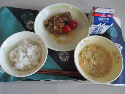 今日の給食のおかずは「海のお野菜スープ、タコスミート、トマトチーズサラダ」でした。海の野菜と聞いて、何を思い浮かべますか。・・・正解は「もずく」です。もずくたっぷりのスープは、つるつるっとして暑い夏にぴったりでした。