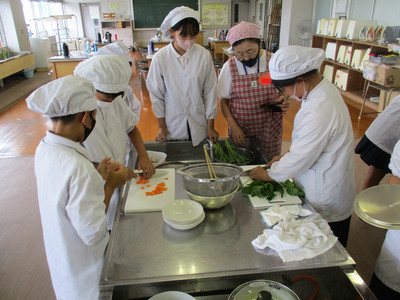 午前中、5年生たちは家庭科の調理実習で「ゆで野菜」の調理をしました。地域学校協働活動推進員の西村さんのお声かけで3人の民生委員さんに来ていただき、4人の地域の先生と一緒の調理実習となりました。「〇〇先生、来て下さい!」と5年生たちはすぐに打ち解けて、たくさん教えてもらっていました。地域の先生と一緒に調理をして安心だったでしょう。みんなとても嬉しそうでした。ぜひ、家でも再挑戦してくださいね。
