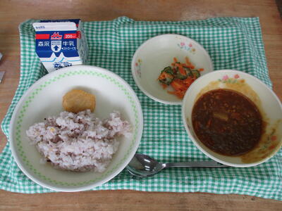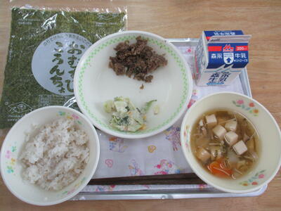 今日の給食のおかずは「とりゴボウ汁、大豆入り豆腐焼き、甘酢和え」でした。ゴボウやニンジンなどの根菜類がたっぷり入った汁物は、元気がでます。おいしい和食メニューでした。