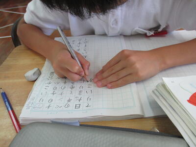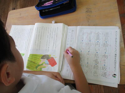 あおぞら2組では、黙々とノートに向かう子どもたちの姿。「まいごのかぎ」という物語文で、各場面で起きた出来事とその様子、主人公の心情を考える授業でした。物語に書かれていることをもとに自分の考えを整理していきます。ノートを見ると実にていねいにびっしりと自分の考えを書いていて感心しました。鉛筆の握り方もばっちり!