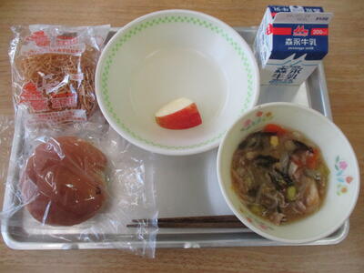 今日の給食のおかずは「パリパリ焼きそば、パインパン、りんご」でした。餡(あん)をかけて食べるパリパリ焼きそばは、子どもたちにも大人気です。お肉や野菜がたっぷり入って美味しかったですね。