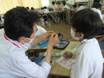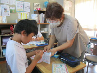 今日はたくさんの地域の先生に来ていただきました。5年生たちは、家庭科の学習で裁縫に挑戦。針に糸を通し玉結び、玉留めをして波縫いに進みます。ほとんどの子にとっては初めての経験。糸を通すところから、針をどう持ち動かすのか、一つ一つの動きに戸惑いながら、地域の先生に教えてもらいがんばりました。根気のいる作業をやさしくていねいに教えてくださった先生方、ありがとうございました。