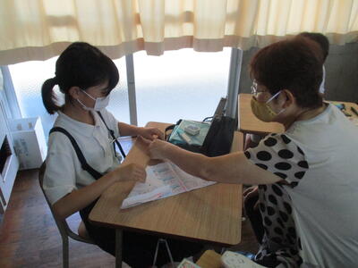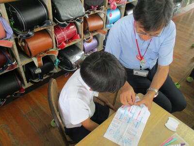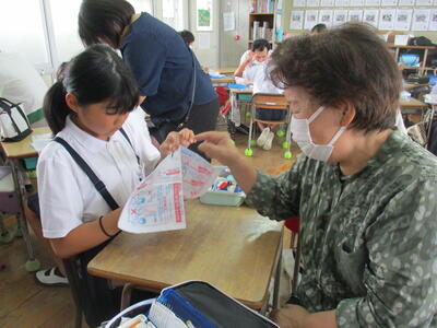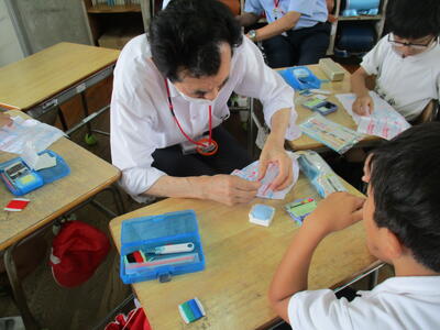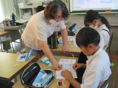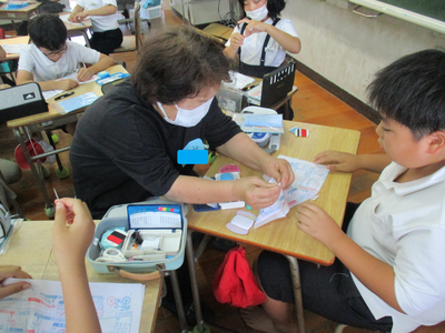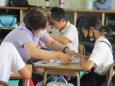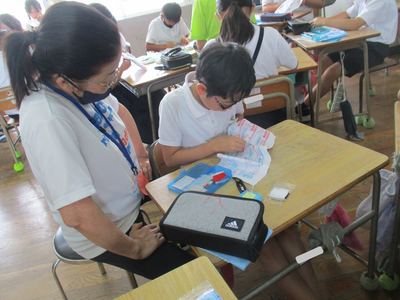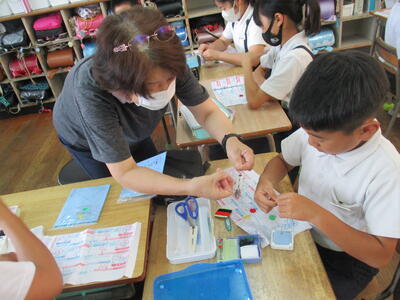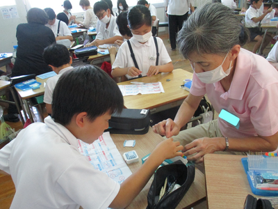 3週連続で地域の先生方にきていただき、5年生たちが針と糸の使い方を教えていただきました。今日はボタン付けです。これまで教えてもらった先生に班に入っていただき、引き続き教えてもらいました。もうすっかり先生と親しくなった子どもたちは、先生方の姿が見えると笑顔、握手を求め、挨拶を交わし、裁縫の学習に入っていきました。回を重ねたことで5年生たちの針の運び方がずいぶん滑らかになってきました。今日はボタン付けに挑戦でしたが、困ったところを教えてもらい、一針一針ていねいに縫っていました。できるようになると、自信がつくものです。よかったね、5年生のみなさん。地域の先生方、今日も優しく教えていただいて、ありがとうございました。