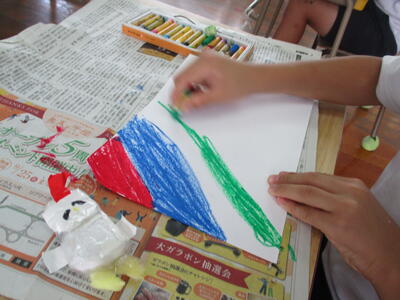 あおぞら1組では、クレヨンを使ったスクラッチに挑戦です。まず、真っ白い画用紙にいろいろな色のクレヨンを使いカラフルに塗り込みます。その上から黒のクレヨンを重ね塗りして、真っ黒な画用紙に。そして、割り箸などの先のとがったもので引っかいて好きな絵を描いていきます。子どもたちはアニメのヒーローを描きたくて、先生と一緒に仕上げていきました。私も小学生の頃、花火を描いたことを思い出しました。