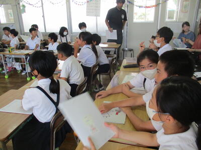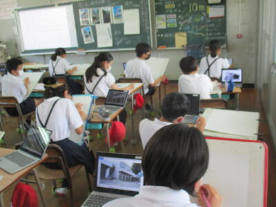 6年生たちは、西村さん(地域学校協働活動推進員)の助言を受けながら、風景画に挑戦しました。題材は校舎。この高道小で過ごすのも残り9ヶ月になった6年生たち。卒業を前に、思い出いっぱいの校舎を絵に描いておくことで、宝物になりそうです。絵の中に、その子その子の思いが入っていきます。はじめは外で描いていましたが、厳しい暑さだったので、タブレットで写真にとり、教室で構図を考えました。少しずつ少しずつ。楽しみですね。