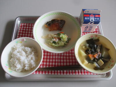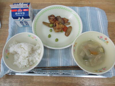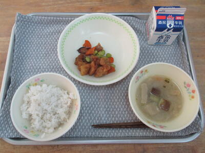 今日の給食のおかずは「なすの味噌汁、チキンチキン根菜」でした。今が旬のなすが入った味噌汁は、さっぱりとしてとても美味しかったです。