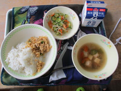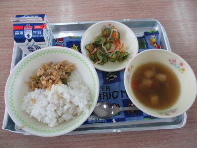 今日の給食のおかずは「つくねスープ、そぼろ丼、ナムル」でした。そぼろ丼の具には、なんと切り干し大根が混ぜ込んでありました。切り干し大根のカルシウムは大根の20倍もあるそうです。栄養たっぷり!ごちそうさまでした。