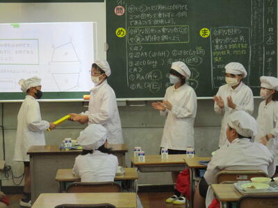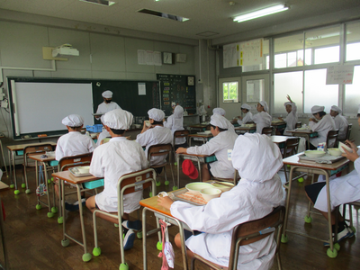 今日は、6年生の荒平先生が出張だったため、授業に入り、一緒に給食を食べました。いつもにぎやかな6年教室。しかし、テストが始まるとシーン。テストが終わって各自で読書を始めてもシーン。給食を食べ始めてもシーンと静かです。黙々と落ち着いた姿は、さすが6年生でした。まだまだ感染症も流行しているようです。卒業までに賑やかな給食時間が戻ってきてくれるといいですね。