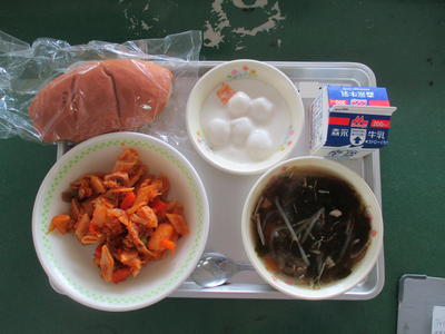 今日の給食のおかずは「海のお野菜スープ、じゃがいものケチャプ煮、白玉ヨーグルト、コッペパン」でした。給食のパンは、小麦の香りと味がしっかりとして美味しいです。子どもたちもパンの日を楽しみにしています。