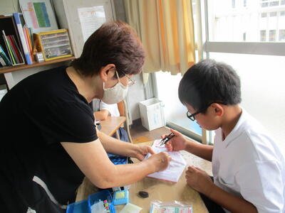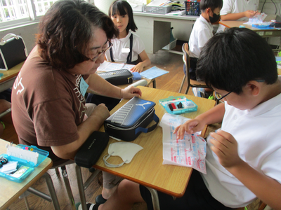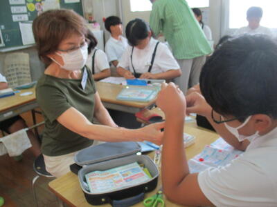 先週4日に玉結びや玉留めを教えてもらった5年生たち。今日は、返し縫いの仕方を学びます。一人一人の「困った・わからない」に対応できるように、今日は9人の地域の先生に来ていただきました。4,5人の班に一人もしくは二人でサポートしてくださいます。5年生たちも、先週来ていただいた先生方のことをすっかり覚えていて、「〇〇先生、教えてください」と、積極的に声をかけ学んでいました。今日もやさしくていねいに教えていただき、ありがとうございました。