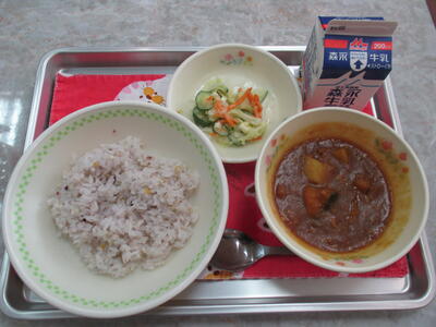 今日の給食のおかずは「夏野菜カレー、チーズサラダ、雑穀ご飯」でした。カレーに入っていると、苦手な野菜もどんどん食べられそうです。おいしかったです。