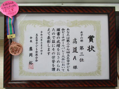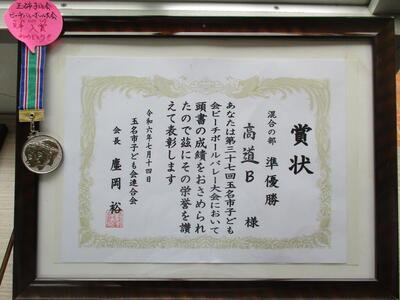 14日(日)に玉名市総合体育館で、玉名市子ども会ビーチボールバレー大会が開催され、高道小からは4,5,6年生を中心に3チームが出場。そのなかの2チームが準優勝と3位に入賞しました。おめでとうございます!! 入賞を逃したチームも、最後まで全力でボールを追いかけていましたね。これまで毎週練習を続けてきた成果を発揮し、チームのみんなで声をかけあい、ボールをつなぎ、よく頑張りました!! にこにこ・はきはき・こつこつの姿です。準優勝の6年生混合チームの皆さん、8月の県大会もがんばってください。くれぐれも熱中症には気を付けて。