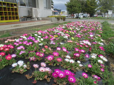 花壇が春の花でいっぱいになり始めました。小北先生が種から育てられたリビングストーンデージーやノースポールなどの花苗を次々に植えてくださっています。教頭先生も一緒になって花壇づくりを進められています。