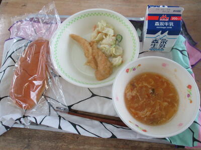 今日の給食は「ミルクパン、卵とトマトのポカポカ生姜スープ、ささみのレモン付漬け、マカロニサラダ」でした。体がじんわり温まるスープでした。給食センターの皆様、毎日美味しい給食をごちそうさまでした。