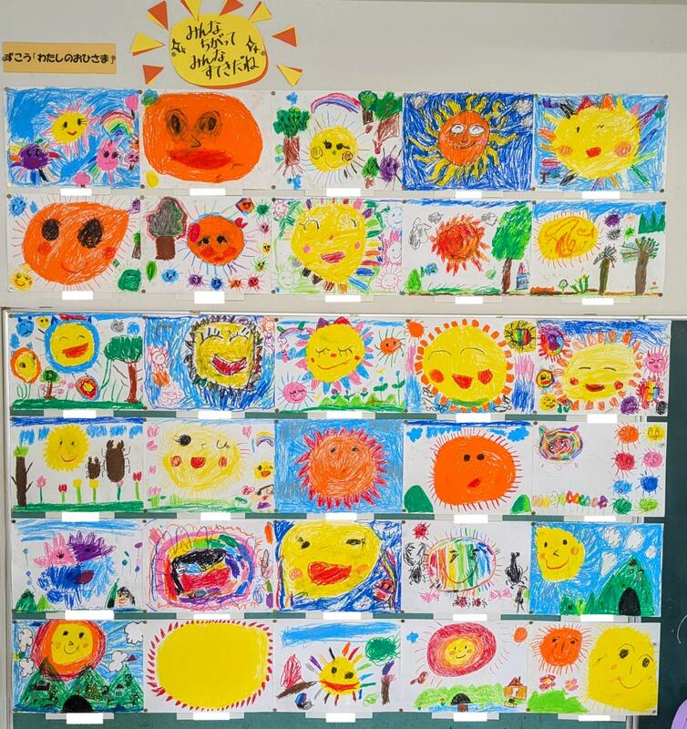本日(4/28)は、1年生教室からお届けします!1年生教室の背面にはられているのは、何ともかわいらしく愛おしい色鮮やかな太陽の絵です!まだまだ始まったばかりの小学校生活に喜びや楽しみをたくさん見つけて過ごしていることが伝わる、明るい太陽です!