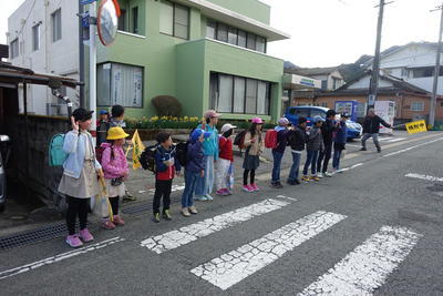本校では、登校班を編成して集団で登校しています。登校班長のかけ声に合わせて「右よし、左よし。」左右を確認して渡ります。新一年生もお兄さん、お姉さんの姿を見ながら練習中。