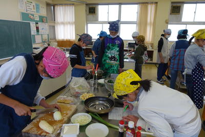 6年生家庭科で献立を考える学習があります。栄養のバランス、見た目、材料、量などを考慮し自分たちで献立を考えます。作り方を自分たちで調べ、グループの動きを行程表にまとめて実習のスタートです。切ったり、炒めたり、片付けをしたりと自分にできることを探しながら取り組みました。自分たちで作った料理はおいしかったようで、給食と一緒にでしたがすべて食べきることができました。家庭でもこの姿が見られることを期待しています。