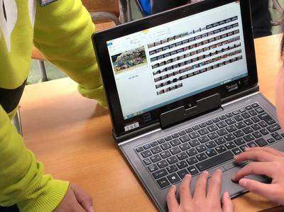 ICTはツールだという言葉を耳にします。辞書やコンパスと同じように、効果的に活用する。それはどのようなこどもの姿なのでしょうか。本校の子どもたちにとってタブレット端末の活用は日常の一つです。メディアの特性を理解し、目的や用途を考えながら道具を選択する力が必要となります。6年生の教室では卒業を前に、先生たちに対する感謝の会の準備の真っ最中。動画編集ソフトを活用して、「思い出ムービー」を作っていました。写真を選択し、音楽を選択し、構成を考えます。まさしく道具としての活用でした。
