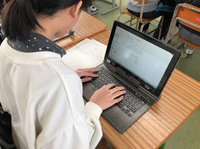 6年生の国語科の授業の様子です。自分で構成した作文の清書を行いました。情報活用能力育成の視点から、清書はタブレット端末を活用して、写真などを取り入れながら作文を完成させていきます。6年生にもなるとタイピング能力も向上し、800字程度であればそんなに時間をかけることなく入力できます。自分の思いの伝える方法を思考し、表現しようとする子どもたちの姿がありました。