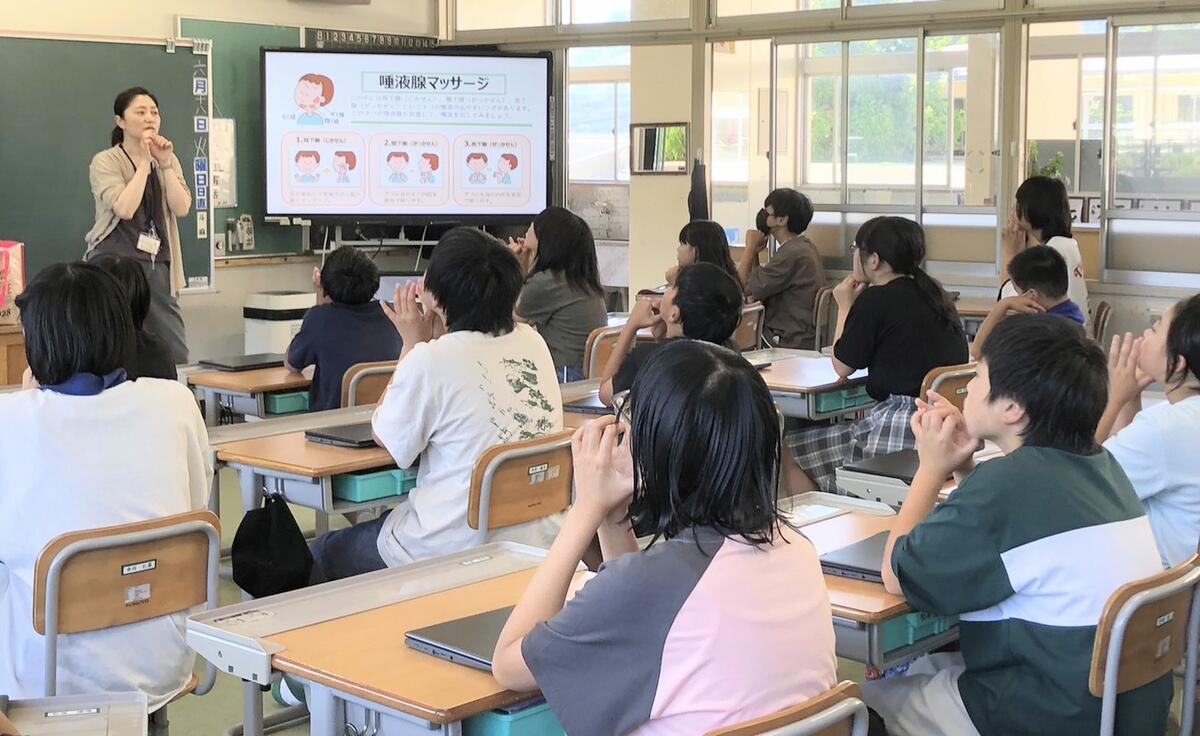 写真は、6月に実施している「歯と口の健康週間」に併せて実施している歯の健康に関する授業です。上の写真は、6年生が咀嚼(そしゃく)についての学習の様子です。下の写真は、5年生が参加した「全国小学生歯みがき大会」の様子です!各学年の実態に合った学習を6年間続けることで、素敵な未来の自分を作り上げるに違いありません。