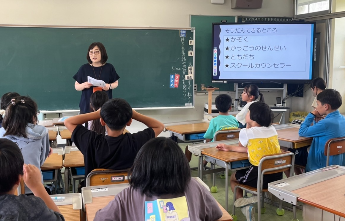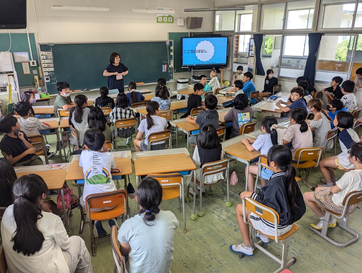写真は、本日(7/2)の5年生教室です!スクールカウンセラーの来校に併せて、『こころのはなし』をしていただきました。初めに簡単な遊びを通して、「伝えようとすること」「受け取ろうとすること」を体感した子どもたち。言い表せないほどの複雑な気持ちは、言葉やジェスチャー、表情や文字など、何らかの方法で伝えなければ伝わらないこと、ストレスは、活力になることもあるけれど、ためすぎてはいけないこと、ストレスが大きくならないためには、①よく寝てよく食べる。②人にやさしくする。③ほっとできることを見つけよう。④困ったら話をする。以上の4つのことが大切だと教えていただきました。「今、気が合わないと感じる友達がいても、その相手は、自分とは違う考えを教えてくれる人で、きっと、将来助けてくれる人になる。今が全てじゃない。気持ちは変わっていくから、あせらなくて大丈夫!」そんなカウンセラーの先生の言葉に、真剣に聞き入る子どもたちの姿が見られました!最後は、みんなで深呼吸をして、短い時間でしたがこの時間は終わりました。吸うのはアクセル!吐くのはブレーキ!子どももおとなも、吸うばかりでは息が切れてしまいます。ゆっくり、ゆっくり深呼吸をしながら・・・