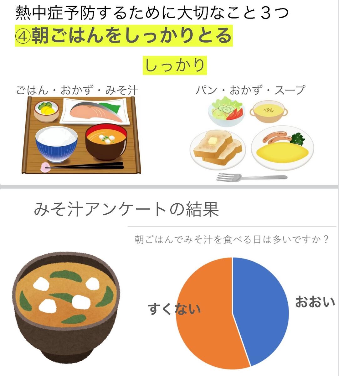 本日の児童集会で、保健委員会から伝えられたのは、「熱中症予防!」これからの季節、知っておくと役に立つ大切な情報を発信してくれました!朝ご飯に味噌汁で塩分を補給することが有効なことなど、子どもたちだけではなく、保護者の皆様にも共有していただきたい内容です!ぜひ、本日、子どもさんが帰宅されたら、本日の児童集会の内容についてご家庭で話題にしていただきたいと思います!