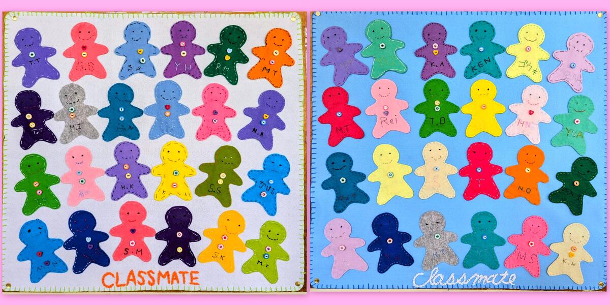 写真は、5年生が家庭科の時間に作った作品です!初めてのソーイングで身に着けた、玉止め、玉結び・なみ縫い・ボタン付けを使って、愛おしい作品が仕上がりました!