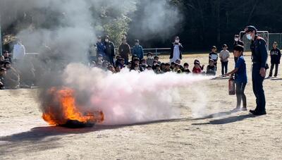 本日は、理科室から出火したことを想定しての避難訓練でした。子どもたちは、職員の指示をよく聞き、安全に運動場に避難することができました。避難訓練後は、1・3・5年生は煙体験を、2・4・6年生は消火体験を行いました。消火体験では、消化器を使うときは、【ピ・ノ・キ・オ】ピンを外す、ノズルを持つ、気持ちを落ち着かせる、押すの手順で行うことも教えていただきました。