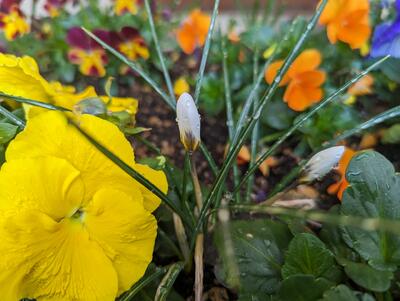 本日(2/20)、雨上がりの暖かい朝を迎えている高森中央小学校。雨上がりの花壇では、クロッカスのつぼみが元気いっぱいです。さて、朝の活動は、縦割り班による6年生への贈り物づくりです!