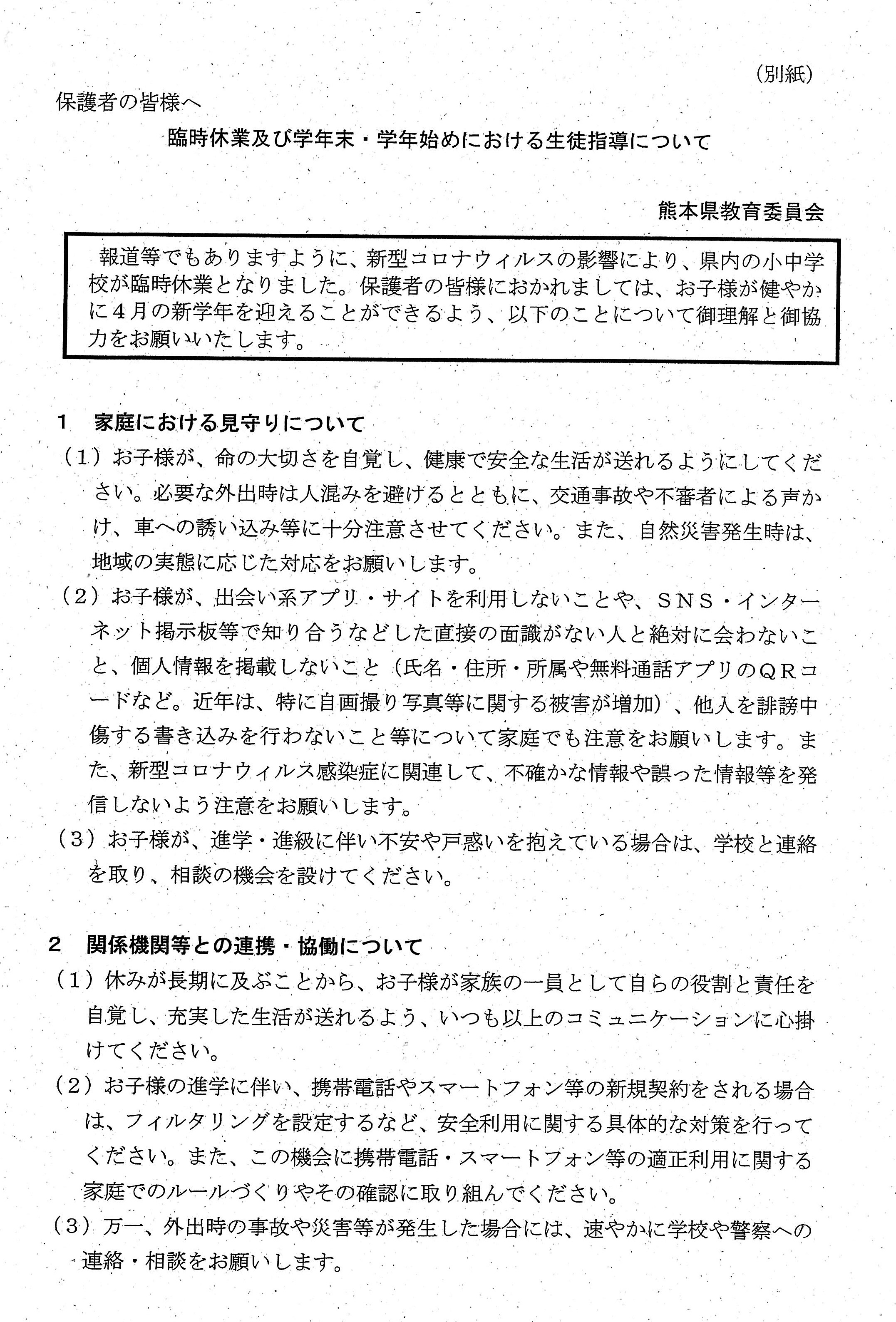 3月3日(月) 臨時休校措置に関する児童への対応について、以下をご確認いただきますようにお願いいたします。 また、熊本県教育委員会より、保護者の皆様あてに通知がありましたので、ご確認をお願いいたします。 臨時休業及び学年末・学年始めにおける生徒指導について.jpg