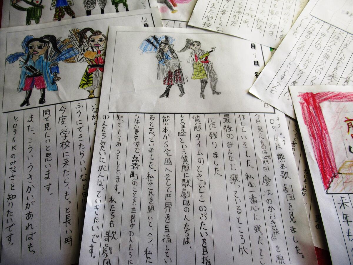本日(12/7)5・6校時、高森中央小学校の体育館を会場に、096k熊本歌劇団の公演が行われ、全校で観劇しました。096k熊本歌劇団は、高森町に本拠を構える2020年旗揚げの歌劇団です。女性のみで構成され、熊本市内の常設劇場を拠点に、コアミックス作品を原作とした舞台公演を行われています。高森中央小学校の子どもたちや職員にも、ファンが多く、昨年に続き行われた公演を、楽しみにしていました。昨年にも増して、迫力満点の素晴らしい歌や踊りに、会場にいた全員が引き込まれました。公演後には、子どもたちから劇団の方々へ質問する機会があり、阿蘇出身の方が活躍されていること、全国からオーディションを経て入団された方々がおられること、熊本から全国へ、そして、世界の舞台を目指されていることを知った子どもたちは、瞳を輝かせていました。本日の公演を通して、子どもたちは、団員の方々の輝く姿に自分の夢を重ね、明るい未来を思い描いたに違いありません!このような素晴らしい機会をいただいたことに心から感謝いたします。そして、096k熊本歌劇団の皆様の夢が、きっと叶いますように心から願います!素晴らしい公演を、本当にありがとうございました!
