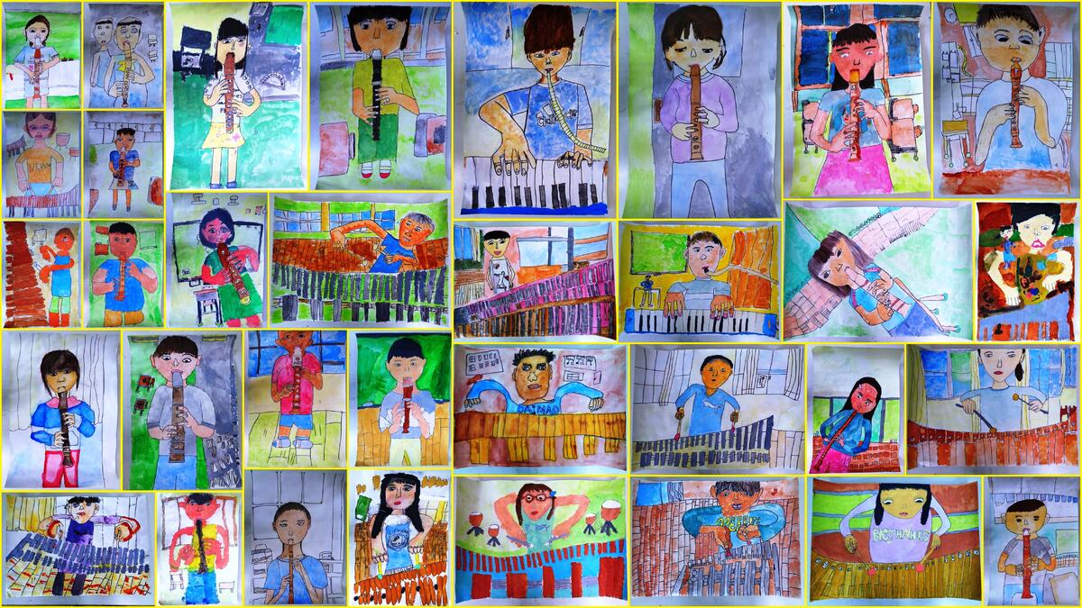本日は、3年生教室で見つけた素敵な絵を紹介します!いつも、教室から素敵な歌声やリコーダーの音色が聞こえてくる3年生教室!描かれた楽器を演奏する子どもたちの絵からも素敵なメロディーが響いてきそうです!